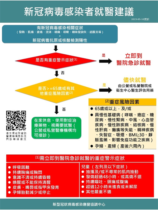 根據《建議》,有新冠病毒感染相關症狀且新冠病毒抗原或核酸檢測呈陽性人士,可按症狀、年齡、是否為孕產婦、是否具慢性基礎病等情況進行自我評估。孕產婦、65歲或以上、具慢性基礎病者,建議到衛生中心、公營或私營醫院接受醫生評估,由醫生視需要處方藥物;而一般健康的青壯年和兒童可自行使用對症治療藥物,或到任何醫療機構就診。
