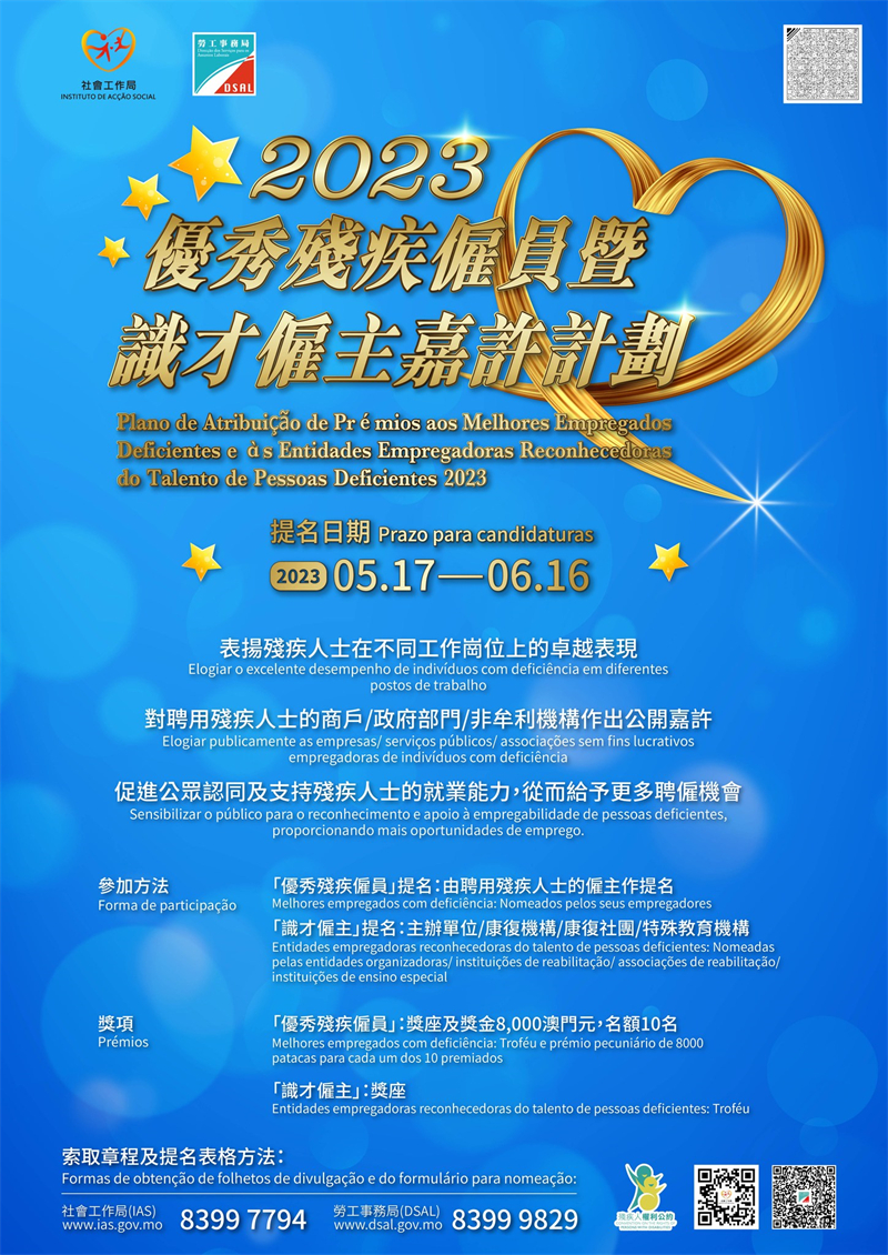 勞工事務局與社會工作局合辦“2023優秀殘疾僱員暨識才僱主嘉許計劃”,表揚本澳在不同工作崗位上有傑出表現的殘疾人士,並公開嘉許聘用殘疾人士的商戶/政府部門/非牟利機構,期望透過活動促進公眾對殘疾人士就業能力的了解及接納,給予殘疾人士更多就業機會,協助他們融入社會。主辦單位誠邀符合資格的提名人,提名現正受僱的殘疾僱員或僱用殘疾人士的僱主參加是次活動,以行動支持他們。