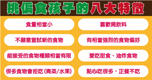 殊不知,這樣只會加大孩子對零食的好奇心及依賴感,吃飯的時候總想著零食,心不在焉的,漸漸的養成了挑食的習慣,也會越來越討厭吃飯!如何發現孩子已有挑/偏食的行為出現?我規納常見的八特徵: