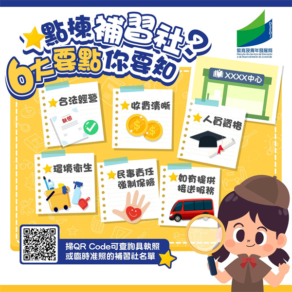 除咗屋企同學校,補習社係學生逗留最長時間嘅地方,為咗更有效保障學生身心健康及安全,《非高等教育私立補充教學輔助中心業務法》喺2023年5月1日正式生效啦,以規範及監察提供相關業務嘅場所、人員及運作。有咗《業務法》嘅監察,家長安排子女到補習社嘅時候就可以更加安心同放心啦。
