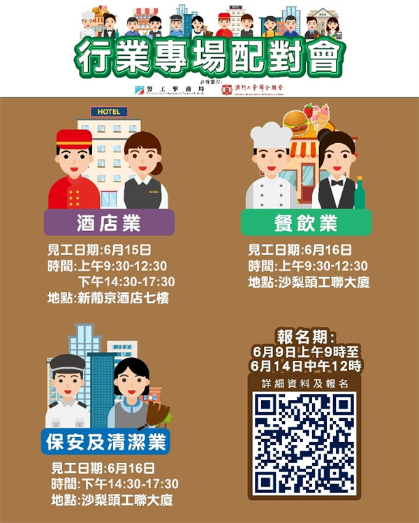 為協助有求職需求的澳門居民盡快就業,勞工事務局與澳門工會聯合總會合作,6月第三周舉辦3場行業專場配對會,合共提供322個空缺。報名日期為6月9日上午9時至6月14日中午12時。