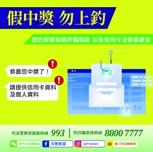 司法警察局訊:近日,司警局接獲多名居民舉報,稱朋友透過網絡社交平台通訊程式向其索要電話號碼,以參加某網購平台的周年抽獎活動,事主提供電話號碼後不久,朋友聲稱事主中獎,進一步要求其提供信用卡資料,並轉發收到的驗證碼以便領取獎金。事主不虞有詐,按對方要求提供有關資料後,發現其網絡社交平台帳號無法登入,信用卡亦遭不明人士盜用。