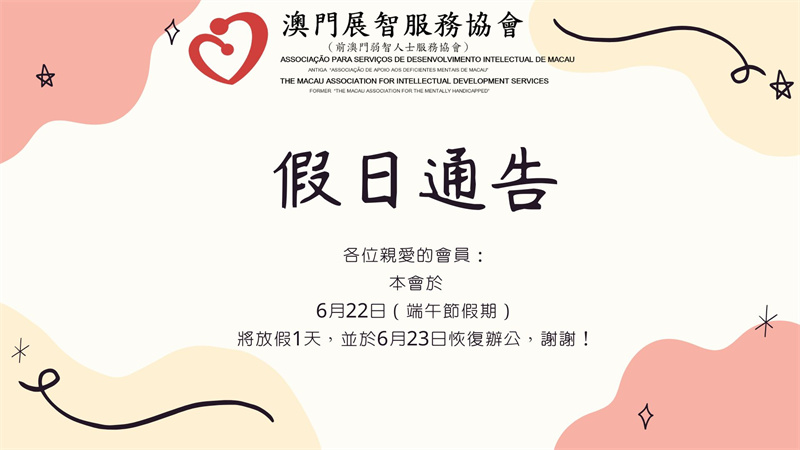 各位親愛的會員:本會於6月22日(端午節假期)將放假1天,並於6月23日恢復辦公,謝謝!