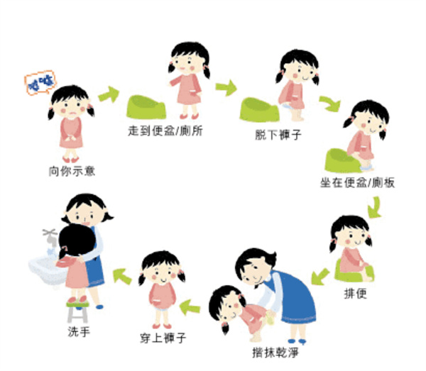 在生活自理的部分,我們也同時要教孩子,如何穿脫褲子,因為如廁訓練除了成功在馬桶上廁所外,也要能順利脫下褲子才能成功如廁。做如廁訓練的時候,如果孩子有想要尿尿的感覺,可以到廁所去尿尿,同時他也必須要能夠順利的脫下褲子,如廁才會成功。如果他已經能夠控制尿尿,可是因為脫不下褲子,如廁訓練一樣不會成功。所以當我們在訓練孩子如廁的時候,除了注意他身體發展經達到成熟的階段,也要在生活自理的部分同步加入訓練,這樣子如廁訓練才會成功。