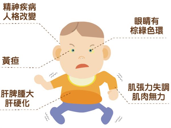 臨床症狀:患者可能會先從肝臟或神經系統出現症狀,例如:在肝臟方面有發炎、壞死及纖維化情況,造成慢性肝炎、肝硬化及猛爆性肝衰竭;在神經系統方面則可能有顫抖、步伐不穩、肢體張力異常、口齒不清、吞嚥困難或情緒不穩等精神問題。