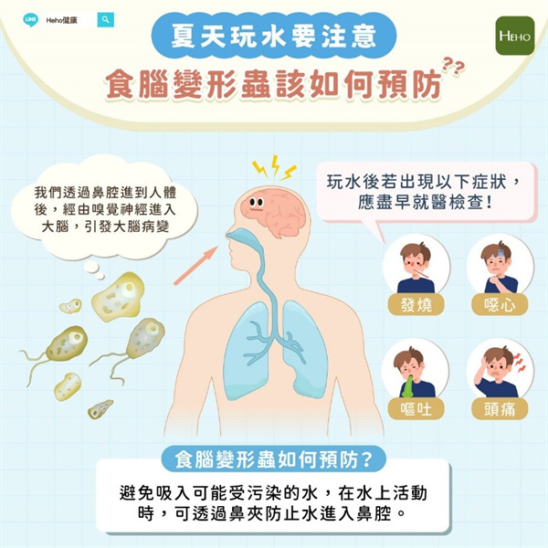 預防方法:避免吸入可能受污染的水是防止感染的主要方法。在參加水上活動或溫泉浸泡時,可以使用鼻夾防止水進入鼻腔,或避免將頭部完全浸入水中。