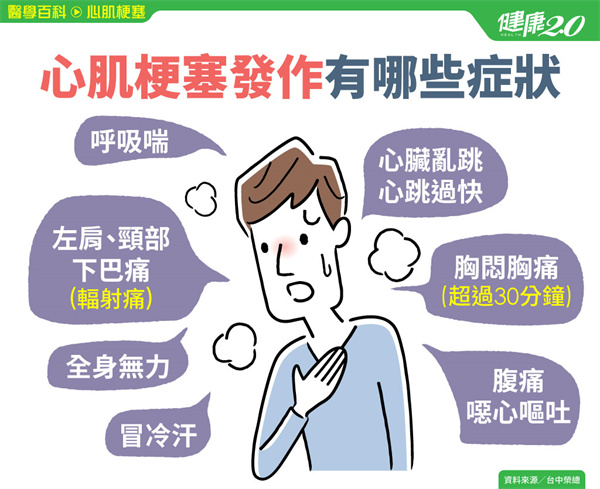 ●胸悶胸痛:持續性的呼吸喘、胸悶或胸痛,胸腹部有重物壓迫感,休息也無法解除,持續疼痛超過30分鐘。