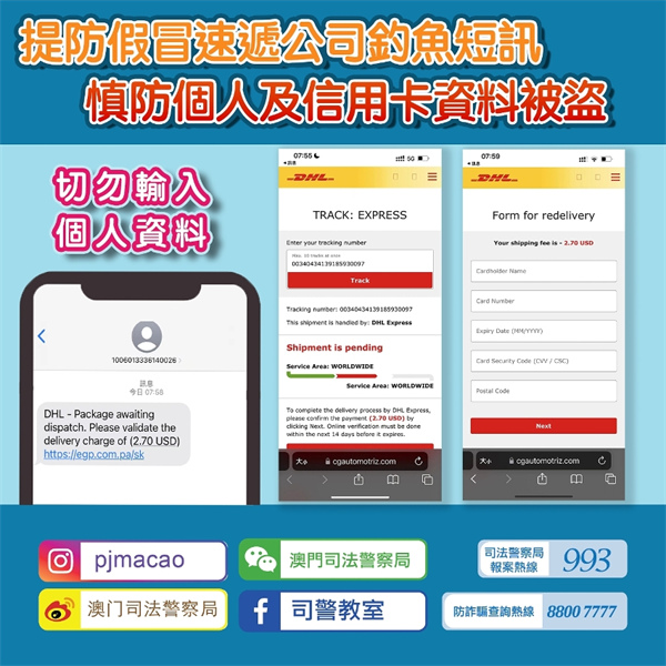 司法警察局近日接獲多名市民舉報,稱其手機收到冒認某快遞公司及附有網站連結的短訊,內容指事主的包裹因欠缺資料而無法運送;點擊該連結後便登入一個顯示為某速遞公司的網站,並表明如要重新寄運需提供個人資料及繳付附加費。