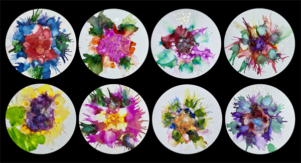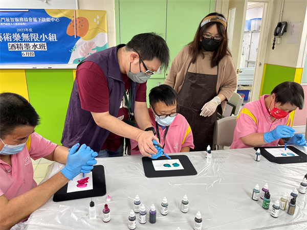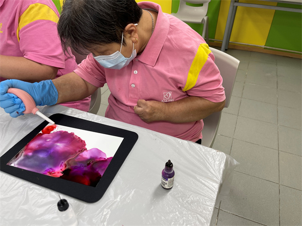 早前,服務使用者參加了酒精墨水班。酒精墨水藝術(Alcohol ink art)屬於流體藝術的一種,是風行於歐美的新興藝術,利用酒精相容、相斥及快乾的特性,透過滴、灑、吹、染及流動的多元技巧將墨水放在專用紙張或特定媒材上制成一幅畫,藉由反覆堆疊與沖刷創造出自然暈染和積漬線條的一種藝術,作品具有獨一無二的美感。因其創作過程簡易,不會出現失敗,只會呈現不同的風格,在過程中服務使用者享受充滿流動性的隨機創意,帶給他們滿滿的成功感,也是一種專注療癒的感受。