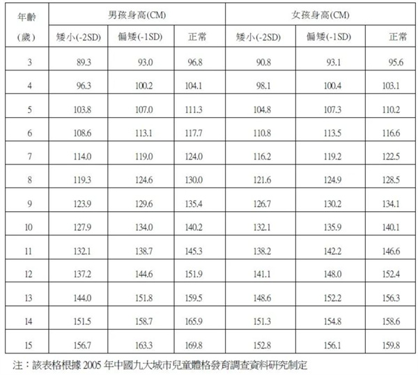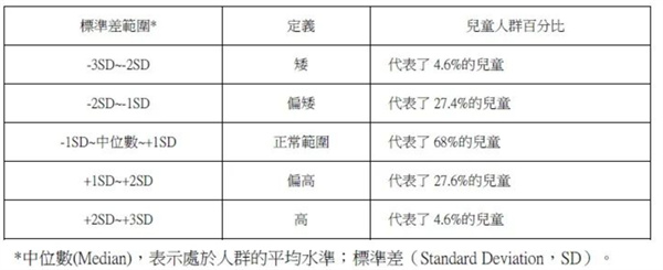 1. 兒童矮小症或矮身材(short stature)是指在相似環境下,身高較同種族、同性別、同年齡健康兒童身高均值低2個標準差(-2SD)以上或處於第3百分位數以下。各位家長可參考身高對照表(上圖)判斷孩子身高處於甚麼水準。