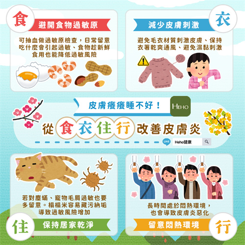 異位性皮膚炎是種反覆發生的皮膚炎症,皮膚會變得乾燥、脆弱、苔癬化,紅腫癢痛,讓人忍不住想伸手抓,有時甚至會讓人半夜癢得睡不著。除了就醫治療外,從日常生活中多留意細節,慢慢改善生活品質也有助舒緩不適,讓這些慢性疾病可以獲得更好的控制。
