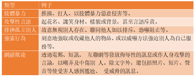 透過肢體暴力、攻擊性語言、排斥、孤立或強索的形式來傷害別人;