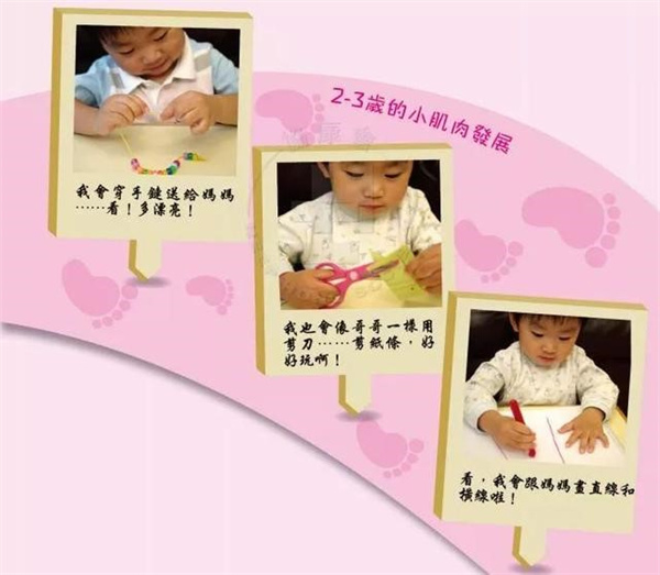 在幼兒的小肌肉發展過程中,0至3歲的發展是最快及最明顯的。在這個階段,嬰幼兒主要是透過不同的感知動作經驗來認識自己和周邊的事物,他們對這個世界充滿好奇,對任何事物也感到新鮮和有趣,雙手便是嬰幼兒用來探索及學習的主要器官。