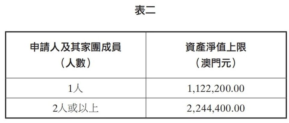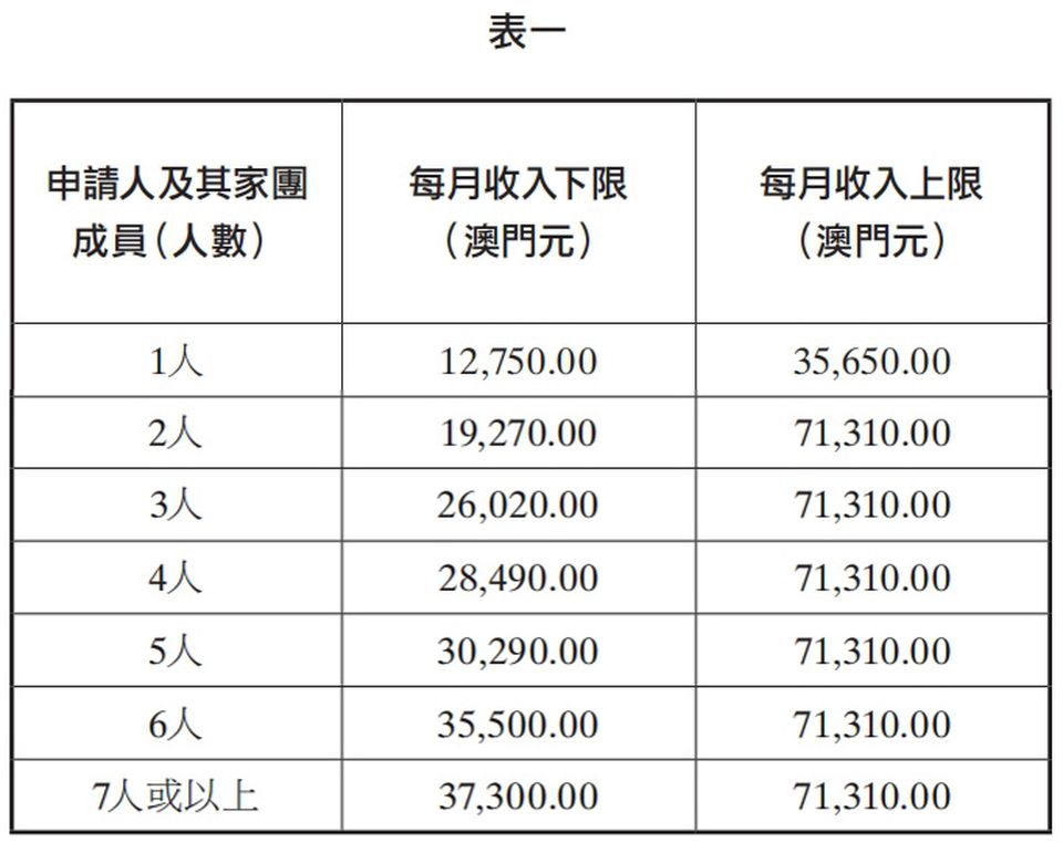 一人家團每月收入上限由38,350元下調至35,650元,二人家團以上的上限由76,690元下調至71,310元。資產淨值上限方面,一人家團資產淨值上限由1,254,900下調至1,122,200元,二人或以上家團由2,509,800降至2,244,400元。
