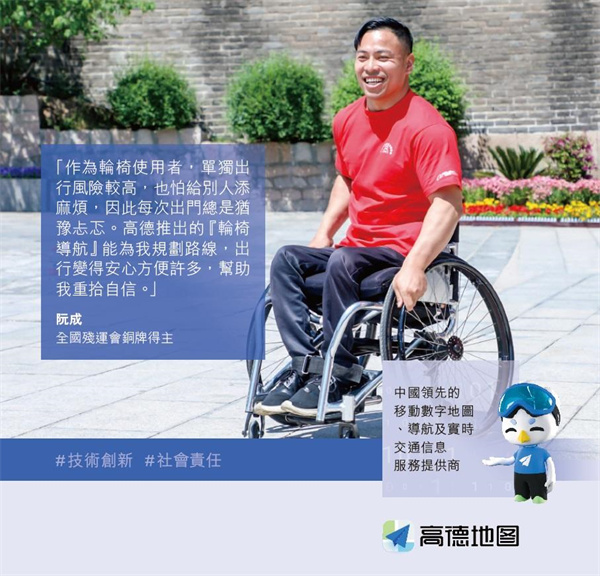 為解決殘障人群和弱勢群體出行的不便,高德在浙江省殘疾人聯合會支持下,開發「輪椅導航」無障礙功能,先後於北京、上海、杭州、成都、深圳等城市上線。公益項目「輪椅導航」最初由阿里員工志願者倡議,獲高德地圖工程師迅速響應,並在3個月後完成上線。「輪椅導航」針對特殊出行需求而開發,在無障礙設施數字化的基礎上,配以相對應的路線規劃和導航策略,緩解輪椅出行人群的焦慮,促進無障礙環境建設。