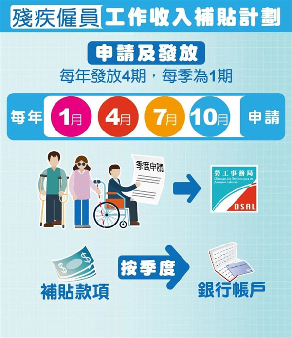 為支援殘疾人士就業,讓殘疾僱員獲得最基本的工資權益,特區政府於2020年11月1日推出《殘疾僱員工作收入補貼計劃》行政法規。根據規定,每年1月、4月、7月及10月接受前一季度的收入補貼申請,符合資格的殘疾僱員由即日起至31日向勞工事務局申請2023年第三季的工作收入補貼。法規生效至今,勞工事務局已接收11個季度的申請,累計收到222份申請,其中共有212個個案符合發放津貼的要求獲發津貼,申請人主要從事保安及清潔服務業、製造業、美容業、零售業及社會福利等行業。