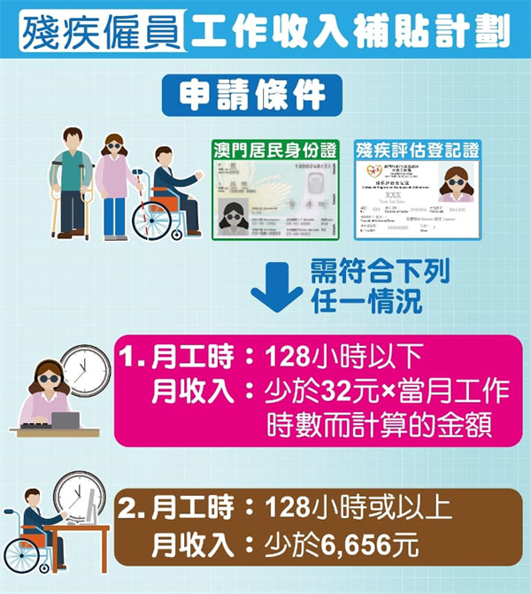 凡持有由社會工作局發出有效的殘疾評估登記證的本地僱員,如按月累計工作總時數少於128小時,且當月工作收入少於《僱員的最低工資》規定的每小時最低工資金額32澳門元乘以當月實際提供工作時數而計算的金額;又或符合按月累計工作總時數等於或多於128小時,且當月工作收入少於《僱員的最低工資》規定的每月最低工資金額6,656澳門元,均可作出申請。