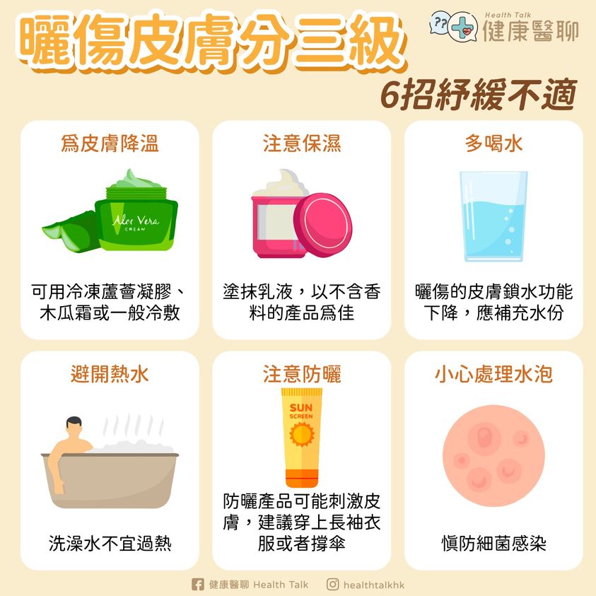 5. 注意防曬:曬傷後繼續曬太陽會令情況惡化,因此更要注意防曬。防曬產品可能會刺激皮膚,建議穿上長袖衣服或者撐傘等防曬。