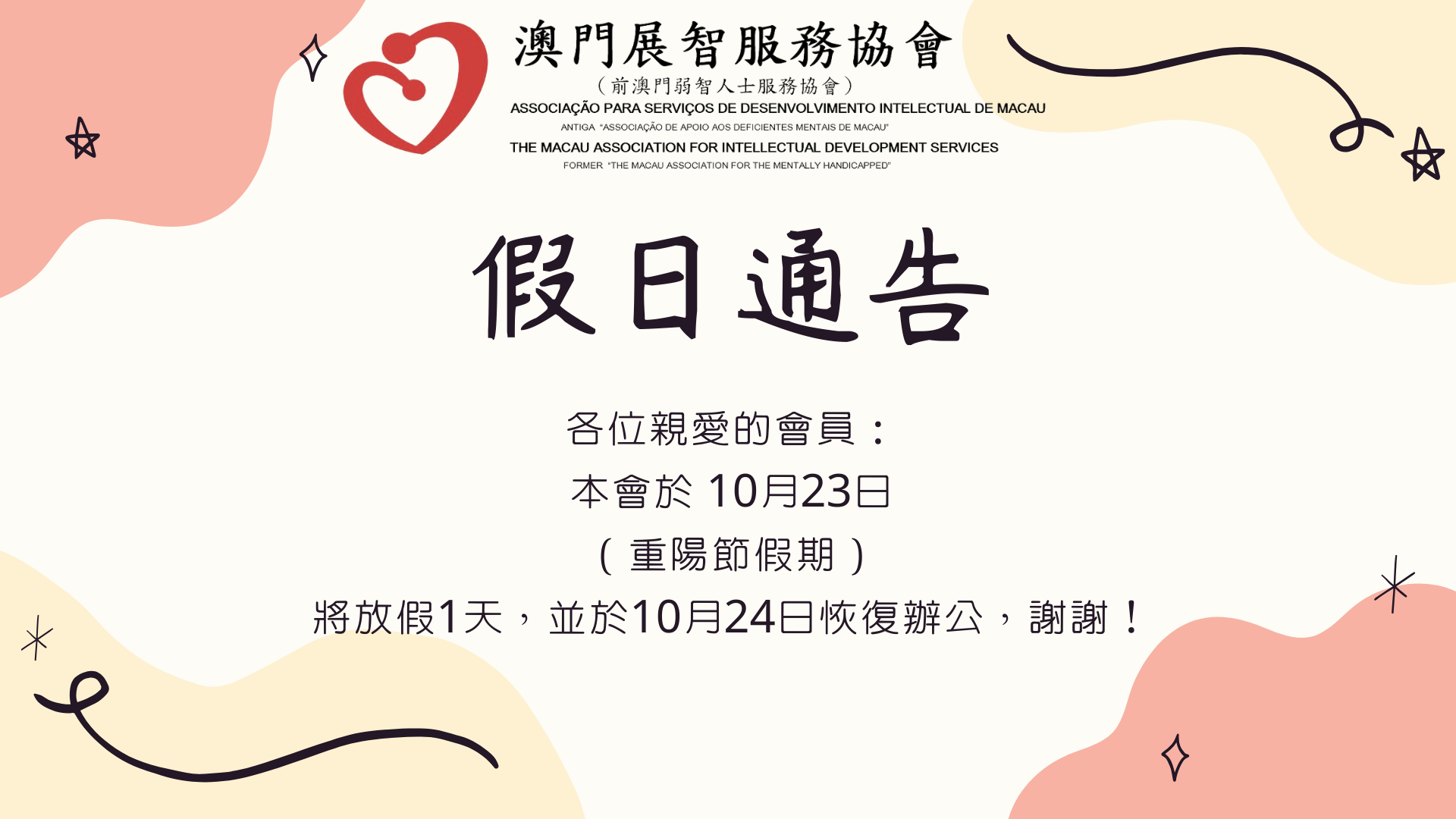 各位親愛的會員: 本會於10月23日(重陽節假期)將放假1天,並於10月24日恢復辦公,謝謝!