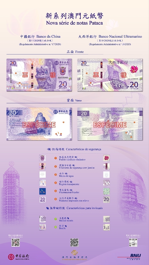 根據第17/2020號及第18/2020號行政法規,中國銀行及大西洋銀行獲准發行全新系列的澳門元紙幣。澳門金融管理局聯同兩家發鈔銀行今(27)日舉行新系列澳門元紙幣介紹會,公佈新系列鈔票設計式樣和防偽特徵,並宣佈拾圓和貳拾圓面額新版鈔票將於明年首季率先投入市場流通。