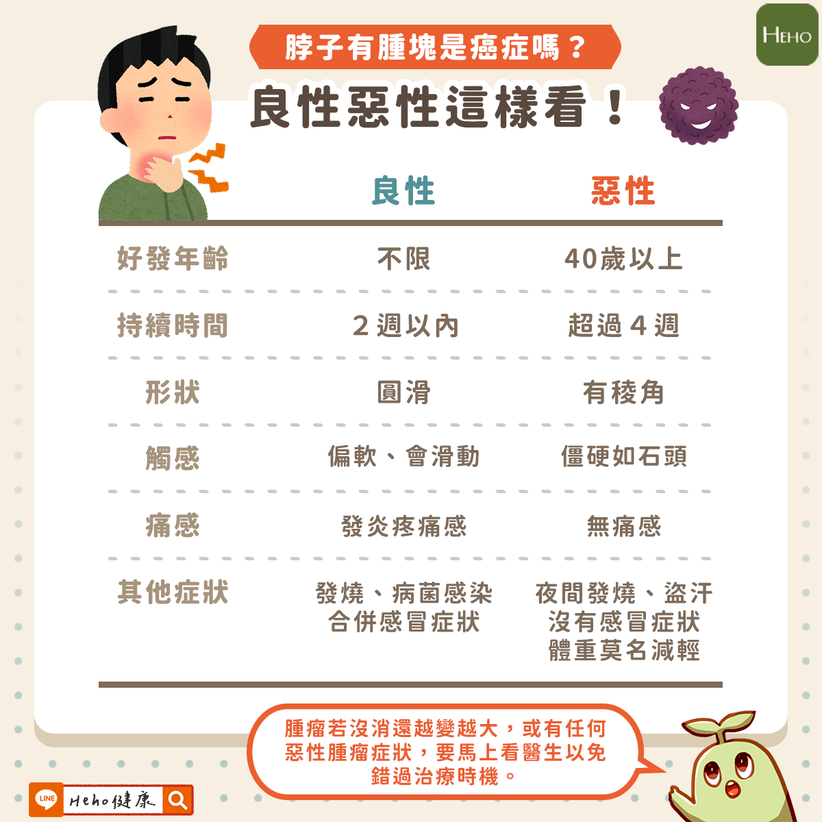 有時脖子突然摸起來腫腫的,還依稀壓得到腫塊,面臨突如其來的身體異狀總讓人心慌慌。會不會是惡性腫瘤?我是不是得癌症了?百般思緒使人緊張兮兮。但脖子腫原因百百款,可以透過簡易的觀察初步判斷自身狀況。