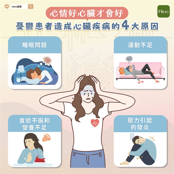 憂鬱症可能導致睡眠問題,進一步影響心臟健康。睡眠不足可能導致心臟無法得到足夠休息,增加心臟病的風險。
