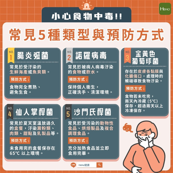 在此整理五大食物中毒類型,提醒民眾如何應對接觸到的高風險食物及預防方式。