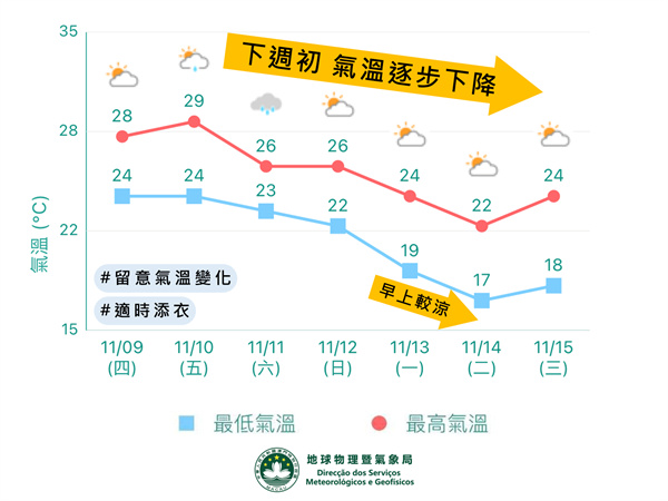 根據氣象部門預報,週初澳門氣溫逐漸下降,將迎來較明顯的降溫。教育及青年發展局呼籲家長和學生留意天氣變化,建議家長提前準備校服和添購相應的保暖衣物,提早做好換季準備,並特別提醒學生日常飲食需注意均衡營養,建立持恆運動習慣,提升身體抵抗力,以應對天氣的變化 。