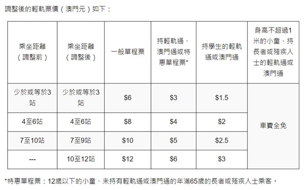 根據《澳門特別行政區公報》公佈第188/2023號行政長官批示,澳門輕軌股份有限公司將自2023年12月8日起增加輕軌票價區間,以配合未來輕軌線網延伸及車站增加。每個涉及媽閣站往來海洋站,以及橫琴站往來蓮花站的跨海段,在計算車站數目時需視作兩站收費。優惠人群的票務待遇繼續保留。有關票價詳情,可向車站工作人員查詢。