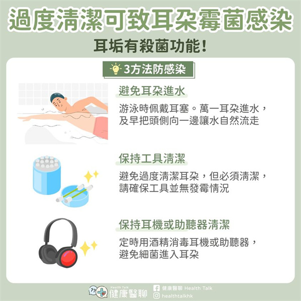 避免過度清潔耳朵,但如果是洗澡或游泳後想稍為清潔外耳道,請確保使用的棉花棒清潔,並無發霉情況。棉花棒和採耳工具應放在通風地方和保持清潔,避免感染耳朵。