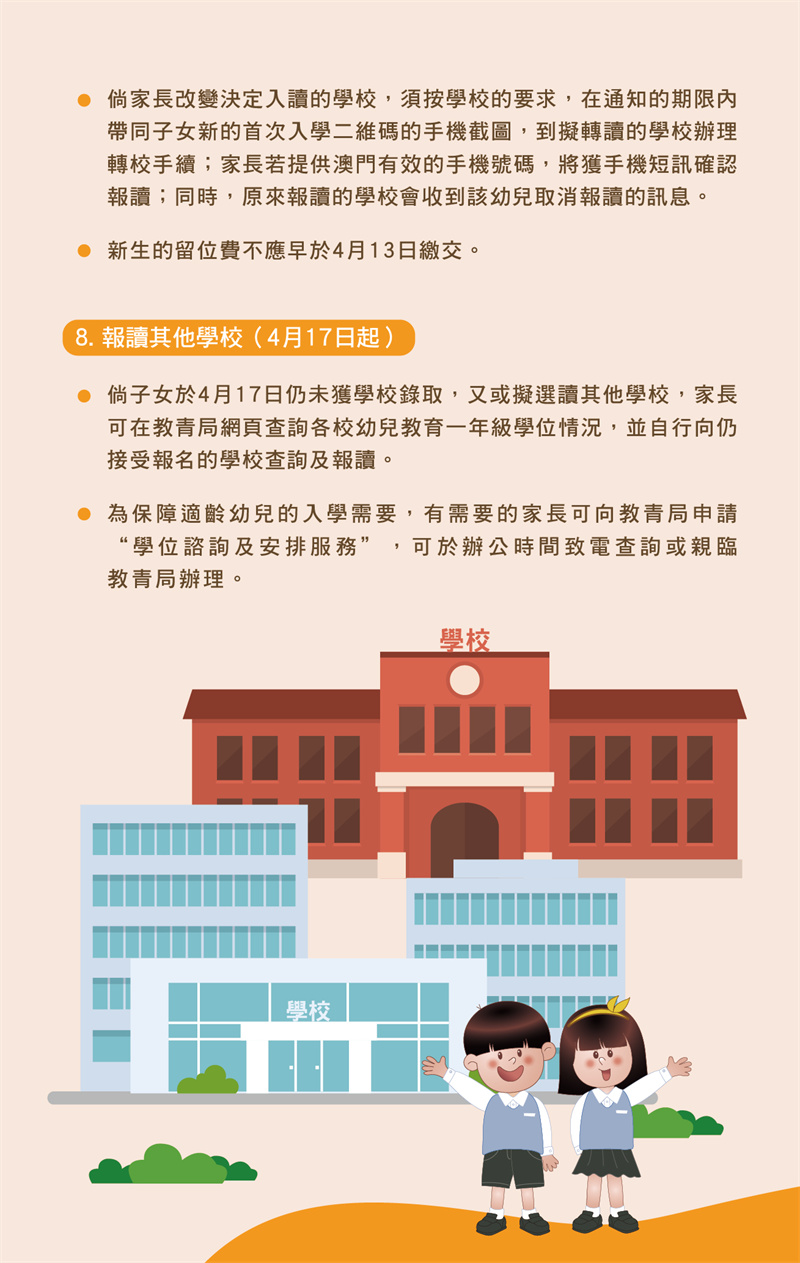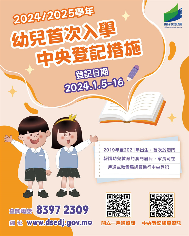 準備係2024年9月首次於澳門入讀幼兒教育嘅小朋友,中央登記前,家長可先為子女開立一戶通,並準備好子女吋半彩色近照嘅正面免冠相片。幼兒首次入學中央登記措施詳情可掃二維碼,又或致電83972309️查詢。