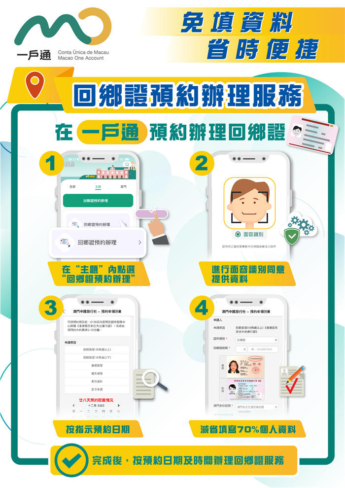 即日起本澳居民可透過“一戶通” 預約辦理回鄉證,在居民的同意下,透過數據互聯,在預約時可免除填寫大部分個人資料,免填寫內容達七成,更方便快捷地完成預約辦證服務。