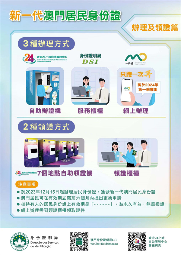 因應推出新居民身份證,身份證明局需要對相關系統進行升級,將於12月15日至2024年1月12日期間,暫停接受居民身份證的特別加快申請,居民如有緊急需要或查詢,請致電2837-0777/2837-0888或電郵至info@dsi.gov.mo。有關辦證詳情,請查閱身份證明局網頁(www.dsi.gov.mo)。