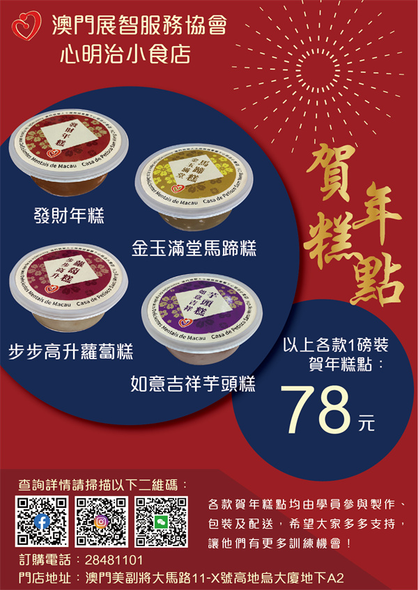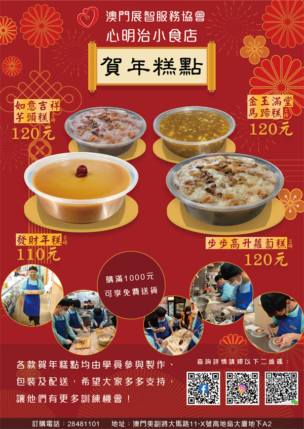 澳門展智服務協會(前澳門弱智人士服務協會)屬下心明治小食店今年推出了一系列賀年糕點及禮盒,今年有四款賀年糕點供大家選擇,包括有「發財年糕」、「步步高升蘿蔔糕」、「如意吉祥芋頭糕」和「金玉滿堂馬蹄糕」,還有三款禮盒可供選擇!你的支持為學員提供了很多參與製作和包裝的訓練機會。