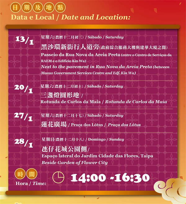 市政署誠邀市民參與活動,在歡度節日的同時,將有禮態度融入生活中,共迎和諧福滿的甲辰龍年。有關活動詳情,可瀏覽市政署公民教育資訊網http://civicedu.iam.gov.mo 或致電市民服務熱線2833 7676查詢。