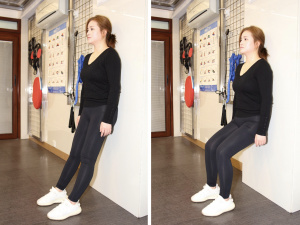 雙腳離開牆邊大概一隻腳的距離,雙腳分間,膝蓋微微彎曲,維持10秒,重覆10次。