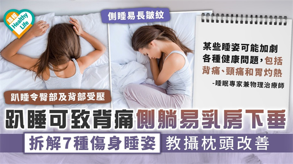 每人習慣的睡姿都不同,但不同睡姿對身體健康都有不同影響。有外國睡眠專家兼物理治療師表示,在最常見的7種睡姿中,包括趴睡、仰睡和側睡等,都可能會形成腰背痛、長皺紋、胸下垂等問題。專家會逐一拆解不同睡姿帶來的問題及成因,並教如何用枕頭改善問題。