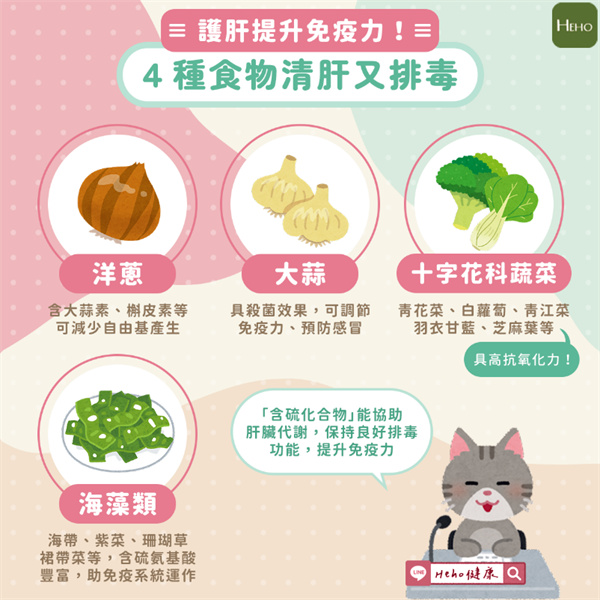 一些蔬菜含有豐富的「含硫化合物」,能提升人體免疫細胞活性、減少自由基產生。而另外搭配多喝水、攝取膳食纖維、正常排便讓毒素好好排出,就能維持良好免疫力。