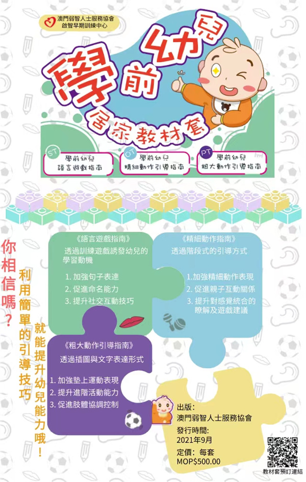 各位家長早上好,由啟智早期訓練中心發佈的《學前幼兒——居家教材套》,旨為透過早療老師或者專業人員所設計的教材,協助家長掌握育兒策略與技巧,讓這套教材當成與幼兒溝通的互動平台,建立和諧的親子關係,並提供引導方法和建議,讓幼兒能持續得到有效訓練,把握轉瞬即逝的重要黃金發展時機。