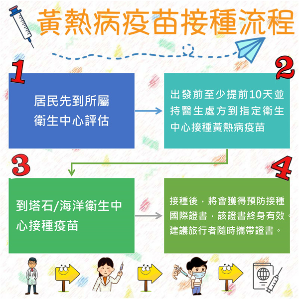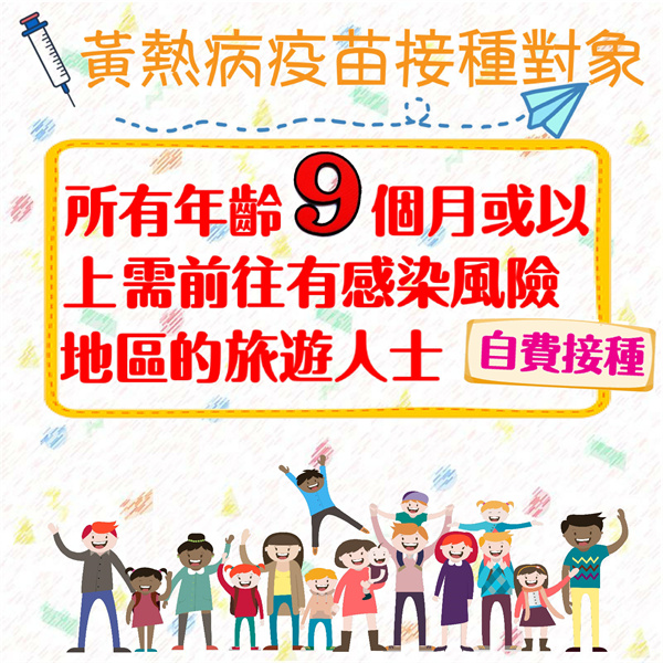1. 年齡滿9個月以上者,前往高風險地區或已有疫情區域,建議接種黃熱病疫苗,且應於出國10天以前接種。接種疫苗後,90%以上的人可產生長期保護力,故不需例行追加接種。