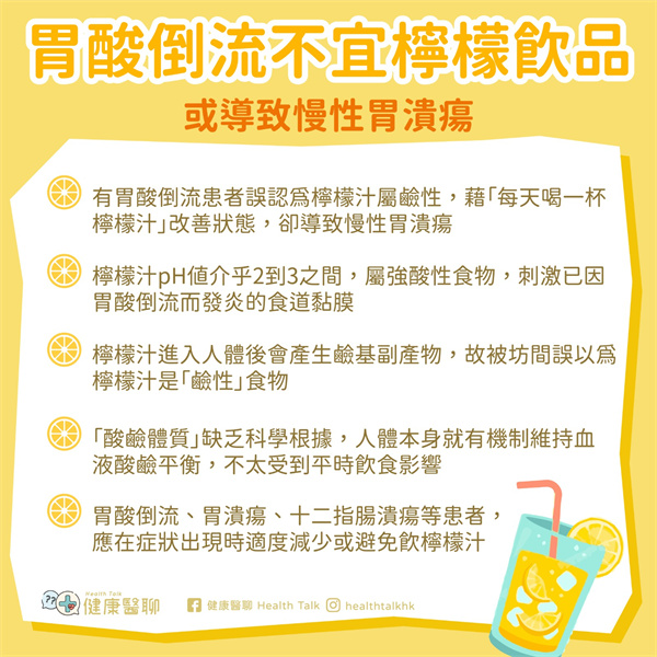 胃酸倒流是常見的消化系統疾病,因胃酸和其他物質物倒流入食道,導致火燒心、胸骨後疼痛、夜咳、咽喉炎等不適症狀。李柏賢解釋上面提到的患者認為,「檸檬是鹼性食物,多食檸檬,可減少胃酸倒流」。不過,這是大錯特錯的想法。