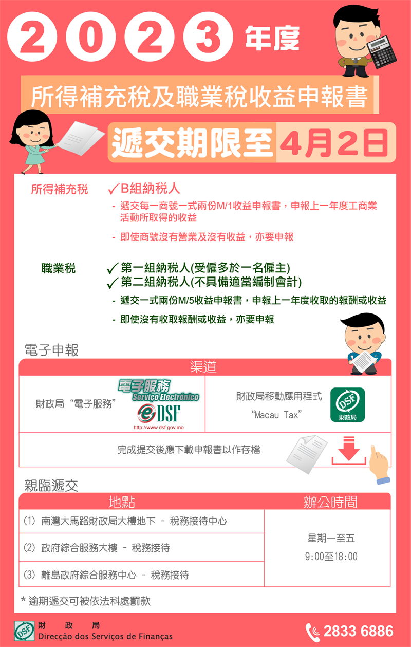 另根據第14/2024號經濟財政司司長批示,倘收益從多於一位僱主處取得的職業稅第一組納稅人,又或不具備適當編制會計的職業稅第二組納稅人,亦須於4月2日或之前遞交一式兩份的2023年度職業稅M/5式收益申報書。