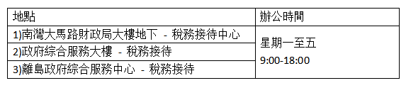 倘納稅人遞交紙本收益申報書,可於辦公時間內親臨財政局以下服務地點遞交: