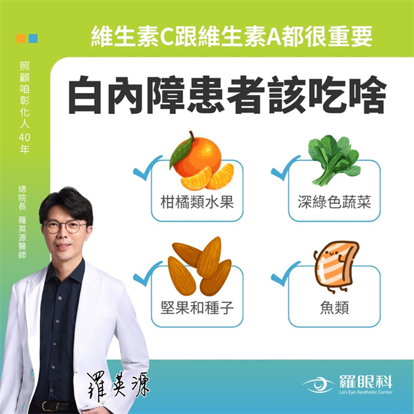 缺乏維生素A會提升白內障的風險。他建議可以多吃一些胡蘿蔔、菠菜、南瓜等橙色和深綠色蔬菜,這些都是維生素A的優良來源。