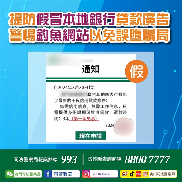 近日司警局接獲有本地銀行檢舉,指有人在網上社交平台冒用該銀行名義發佈不實貸款廣告帖文,訛稱該銀行已推出「最新不良信用貸款條件」,著有意者點擊廣告內附帶之連結進行申請。上述連結點擊後將會跳轉到另一個設置了多個貸款廣告之頁面,曾出現有鄰埠銀行及其他來歷不明之貸款網站,但該等廣告綁定之網站不斷變動,真偽成疑。