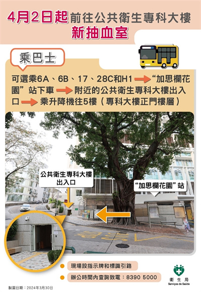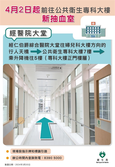 衛生局仁伯爵綜合醫院為了讓居民在更寬敞及舒適的環境中進行抽血服務,以提升接受醫療服務的體驗,自4月2日起抽血服務從原址醫院大堂的抽血室,遷移至公共衛生專科大樓內的新抽血室進行。原址於搬遷日(即4月2日)起停止運作,醫院將以短訊通知已預約人士,相關人士請前往新抽血室報到及接受服務。具體前往路線如下: