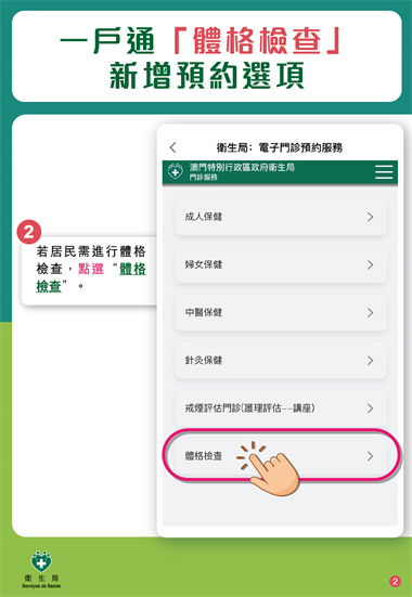 透過上述任何一種網上預約方式點選“我的健康”、“門診服務”、“衛生中心門診預約”,點選 “體格檢查”,再選取所需體格檢查類型進行預約,成功預約後會收到手機短訊提示。有關體格檢查服務須提前14日預約,並可於上述網上“門診服務”內查詢衛生中心的門診預約記錄、辦理改期或取消預約等。若有疑問,可於辦公時間致電所屬衛生中心查詢。