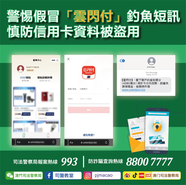 昨日司警局先後接獲十多名市民檢舉,報稱收到以電子支付平台“雲閃付”名義發出的短訊,內容以“積分即將到期”為由誘使事主點擊短訊內附帶之連結,繼而進入一個假冒網站並可以低價及積分兌換禮品,藉此套取事主的個人及信用卡資料,事主在輸入一次性驗證碼後,最終導致信用卡被盜用,造成各事主數千至數萬元不等的損失。