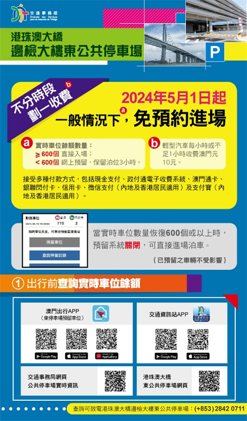 為進一步善用公共資源及促進公共泊車位的合理分配及利用,港珠澳大橋邊檢大樓東公共停車場(下稱:東停車場)自5月1日凌晨零時起恢復收費,收費方式及金額調整為所有車輛不分時段按時收費,輕型汽車劃一每小時或不足1小時收費澳門元10元;停車場接受多種付款方式,包括現金支付、政付通電子收費系統、澳門通卡、銀聯閃付卡、信用卡、微信支付(內地及香港居民適用)及支付寶(內地及香港居民適用)。