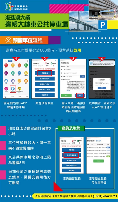 有關東停車場的使用安排詳情,可瀏覽交通事務局網站https://www.dsat.gov.mo/hzmb/carpark_east.aspx 及微信公眾號(服務號macaudsat及訂閱號macau-dsat)。